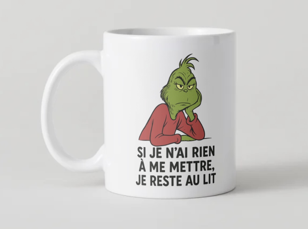 Avec son design humoristique inspiré du célèbre grincheux vert, ce mug de 300 ml t’accompagne parfaitement dans ta flemme assumée. Idéal pour le café, le thé ou le chocolat chaud, il fera sourire (ou râler) dès le réveil 😄